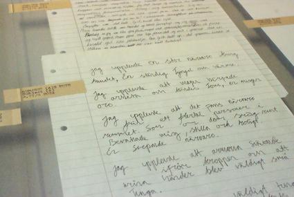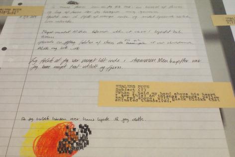 Documentation of Embodied Experiences is an ontological and phenomenological investigation of the mind, body, and spirit space experienced in Energetic Healing. Participants were given one individual healing session performed by the artist, lasting for 30 minutes. After each session, both artist and participant shared their individual experiences in a short text. The notes were displayed alongside the original handwritten notes and small drawings.