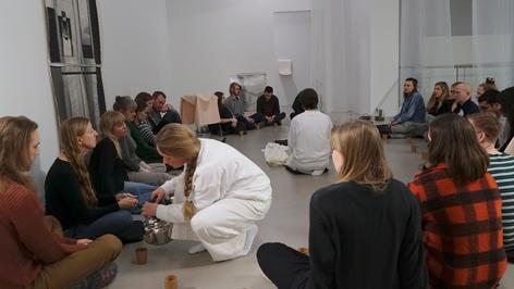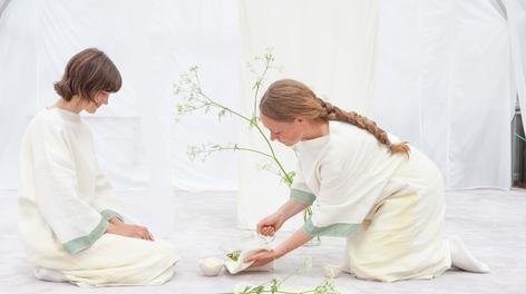 Silent Noon is a performative work created by artists Amalia Fonfara and Hannah Mjølsness /Nine Herbs Charm (NO/US). The work consists of a performative installation that gives room for a sensual and animistic relationship with a native plant, Wild Chervil (Anthriscus Sylvestris) from the local landscape in Norway. Based on tea ceremonies from different cultures and shamanic techniques, the artists explore how we can get in touch with the plant. The work seeks to enable a meeting between visitors and the plant, creating an experience with the plant that exceeds linguistic communication.