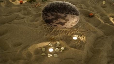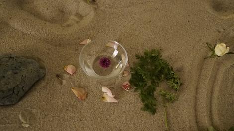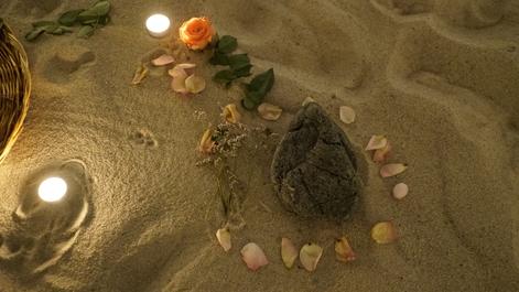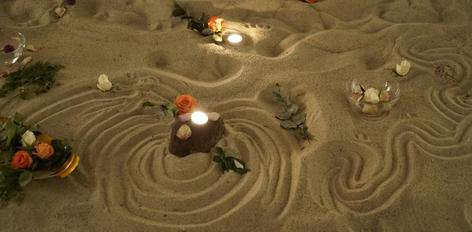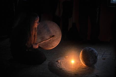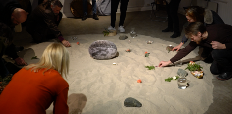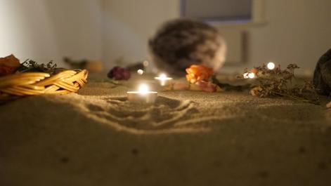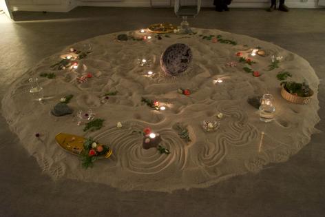 Ritual performance with vocal and drum. Materials: sand, sealskin, wood, stones, candles, flowers, water, soil.
