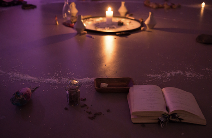 Ritualistic performance. Mixed media: salt, wood, incartations, water, milk, feathers, seeds, plants, candles, Black Books m.m.
