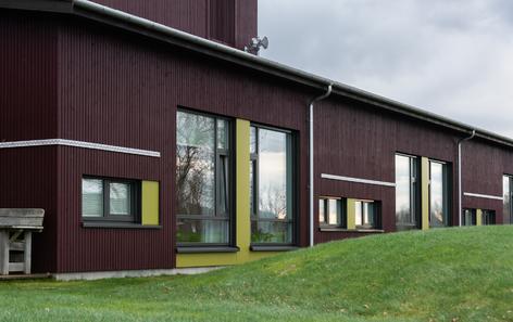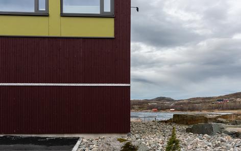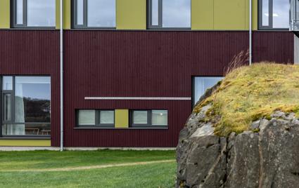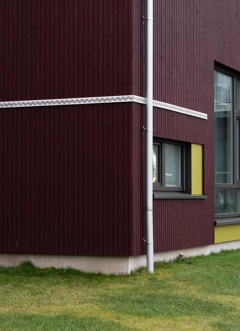 The work is a public installation at Roan Helsehus in Trøndelag Åfhord kommune. The pattern is an old skinnfell pattern that symbolizes water.